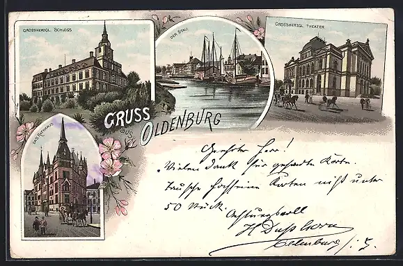 Lithographie Oldenburg / O., Grossherzogl. Theater, Rathaus und der Stau