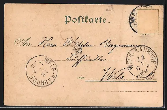 gelaufen 1896, Eckknicke oben und li., Briefmarke entfernt, guter Zustand