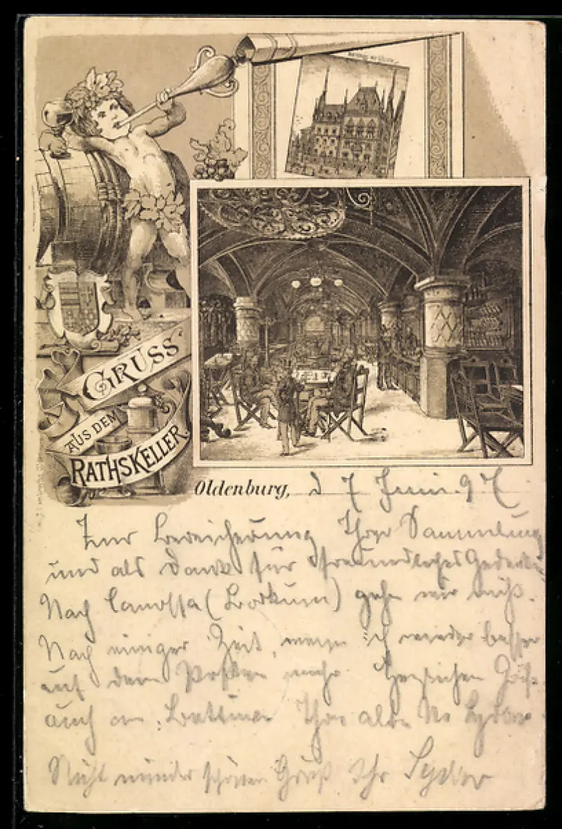 Lithographie Oldenburg, Ratskeller, Innenansicht und Rathaus
