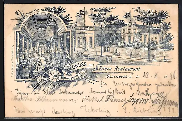 Lithographie Oldenburg i. Gr., Eiler`s Restaurant mit Innenansicht