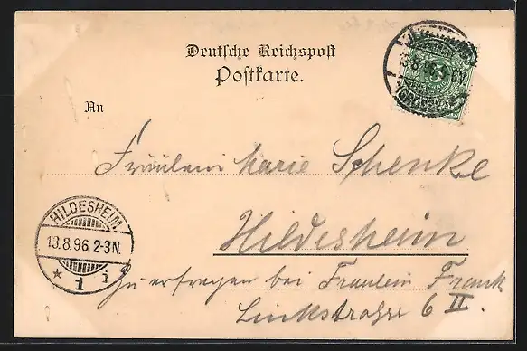 Personenbezogene Daten auf der Rückseite der Karte wurden durch blauen Textmarker unkenntlich gemacht. Die blauen Stellen sind auf die Vorderseite durchgeweicht und wirken sich negativ auf das Postkartenfoto aus