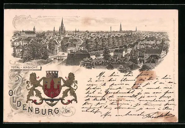 Lithographie Oldenburg i. Gr., Panoramablick auf die Stadt