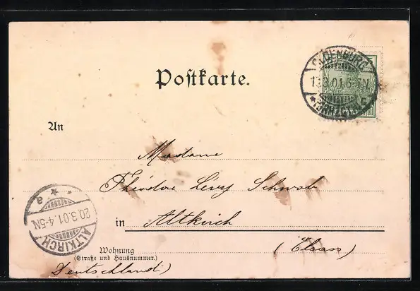Personenbezogene Daten auf der Rückseite der Karte wurden durch blauen Textmarker unkenntlich gemacht. Die blauen Stellen sind auf die Vorderseite durchgeweicht und wirken sich negativ auf das Postkartenfoto aus