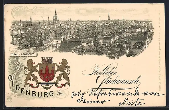 Lithographie Oldenburg i. Gr., Totalansicht, Wappen