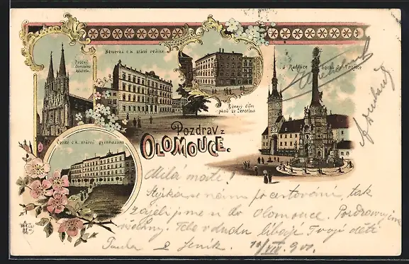 Lithographie Olomouc, Nemecka c. k. starni realka, Radnice Socha Sv. Trojice