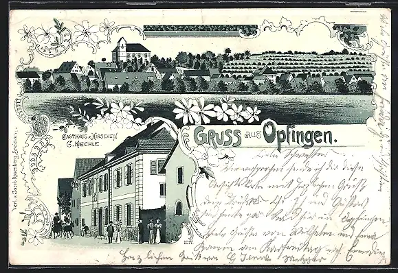 Lithographie Opfingen, Gasthaus z. Hirschen v. G. Kiechle, Ortsansicht mit Kirche