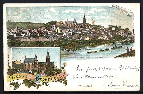 Lithographie Oppenheim, Panorama mit Dampferpartie