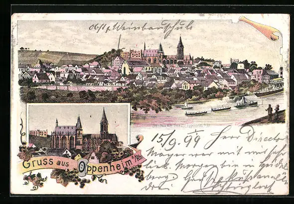 Lithographie Oppenheim a. Rh., Teilansicht mit Dampfer, Kirche