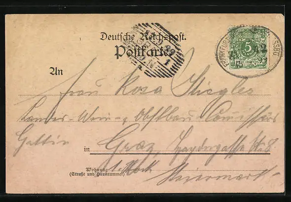 Personenbezogene Daten auf der Rückseite der Karte wurden durch blauen Textmarker unkenntlich gemacht. Die blauen Stellen sind auf die Vorderseite durchgeweicht und wirken sich negativ auf das Postkartenfoto aus