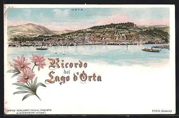 Lithographie Orta, Lago d`Orta, Dampfer auf dem See