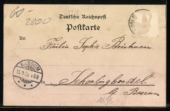 gelaufen 1898, Briefmarke entfernt, rückseitig Oberflächenschaden, guter Zustand