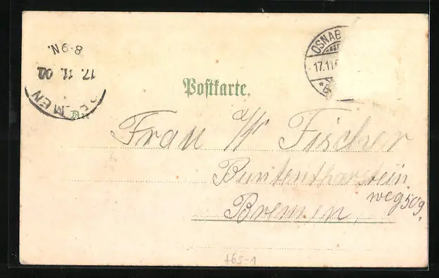 Personenbezogene Daten auf der Rückseite der Karte wurden durch blauen Textmarker unkenntlich gemacht. Die blauen Stellen sind auf die Vorderseite durchgeweicht und wirken sich negativ auf das Postkartenfoto aus