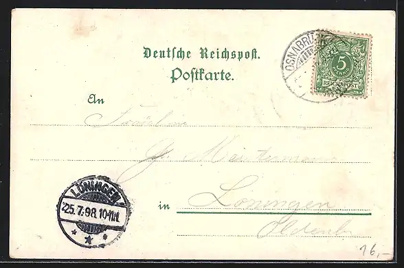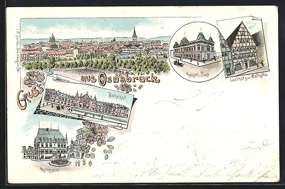 Lithographie Osnabrück, Gasthof zur Walhalla, Kaiserl. Post, Rathhaus, Bahnhof