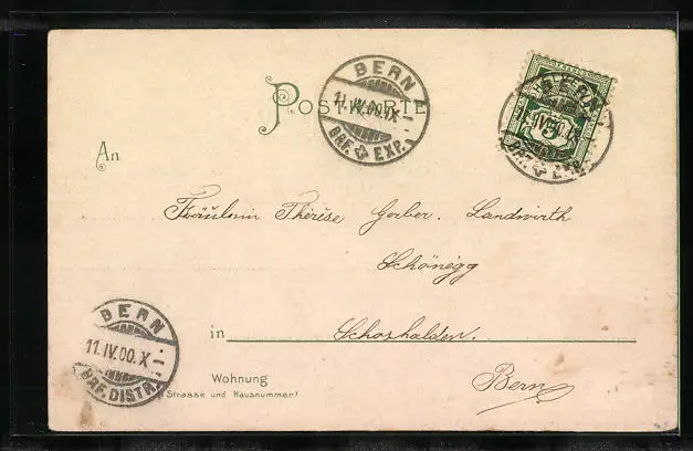 Personenbezogene Daten auf der Rückseite der Karte wurden durch blauen Textmarker unkenntlich gemacht. Die blauen Stellen sind auf die Vorderseite durchgeweicht und wirken sich negativ auf das Postkartenfoto aus