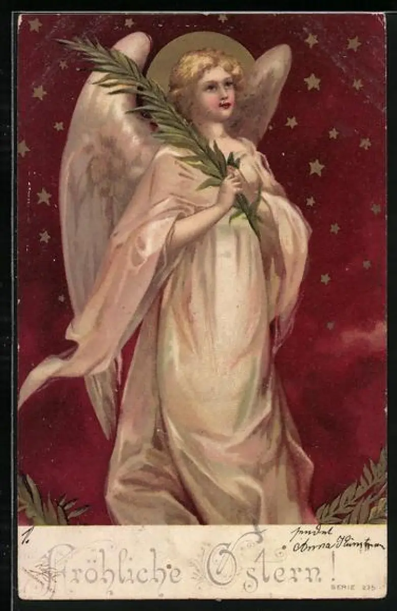 Lithographie Osterengel mit Heiligenschein und Palmenblatt, Fröhliche Ostern