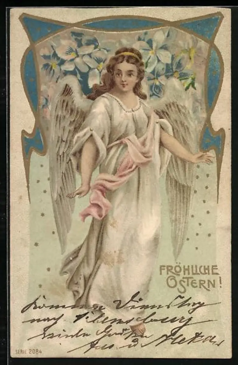 Lithographie Osterengel vor Blumen, Fröhliche Ostern
