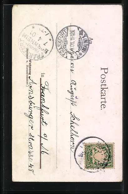 Personenbezogene Daten auf der Rückseite der Karte wurden durch blauen Textmarker unkenntlich gemacht. Die blauen Stellen sind auf die Vorderseite durchgeweicht und wirken sich negativ auf das Postkartenfoto aus