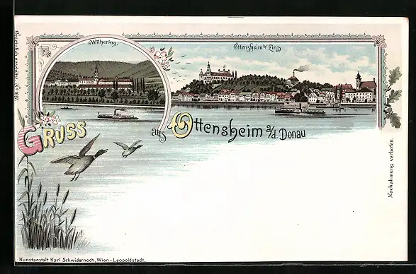 Lithographie Ottensheim a. d. Donau, Ortsansicht mit Dampfer, Withering