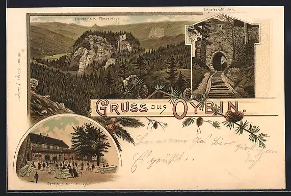 Lithographie Oybin, Gasthaus auf dem Oybin, Aussicht v. Pferdeberge, Schneiderstübchen