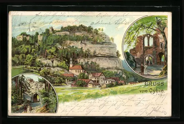 Lithographie Oybin, Teilansicht, Tor, Ruine