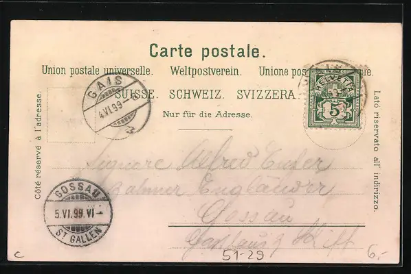 Personenbezogene Daten auf der Rückseite der Karte wurden durch blauen Textmarker unkenntlich gemacht. Die blauen Stellen sind auf die Vorderseite durchgeweicht und wirken sich negativ auf das Postkartenfoto aus