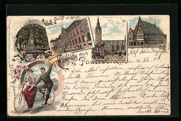 Lithographie Paderborn, Dom, Rathaus, Post, Kriegerdenkmal