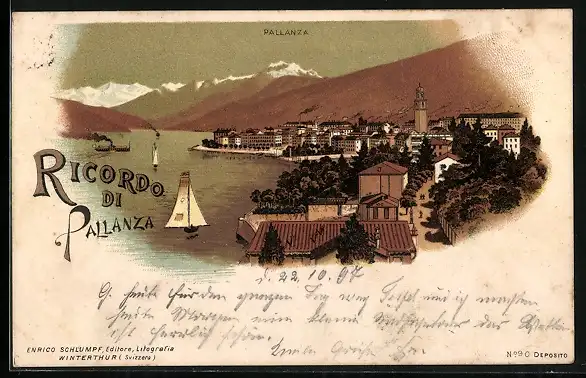Lithographie Pallanza, Panorama mit Ort, See und Gebirge