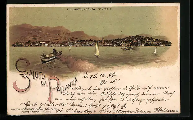 Lithographie Pallanza, Veduta Generale, Dampfer, Segelboote
