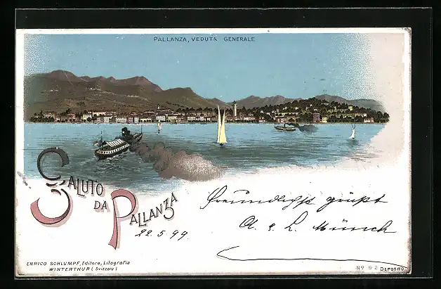 Lithographie Pallanza, Veduta Generale, Dampfer und Segelboot auf dem See