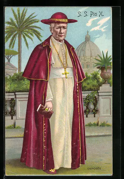 Lithographie Papst Pius X. mit Hut und Gebetsbuch