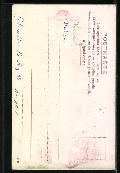 Personenbezogene Daten auf der Rückseite der Karte wurden durch blauen Textmarker unkenntlich gemacht. Die blauen Stellen sind auf die Vorderseite durchgeweicht und wirken sich negativ auf das Postkartenfoto aus