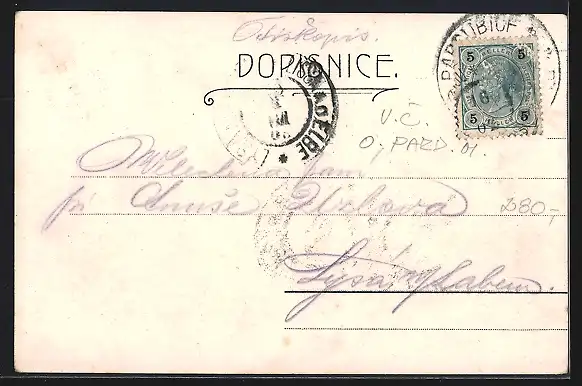 Personenbezogene Daten auf der Rückseite der Karte wurden durch blauen Textmarker unkenntlich gemacht. Die blauen Stellen sind auf die Vorderseite durchgeweicht und wirken sich negativ auf das Postkartenfoto aus