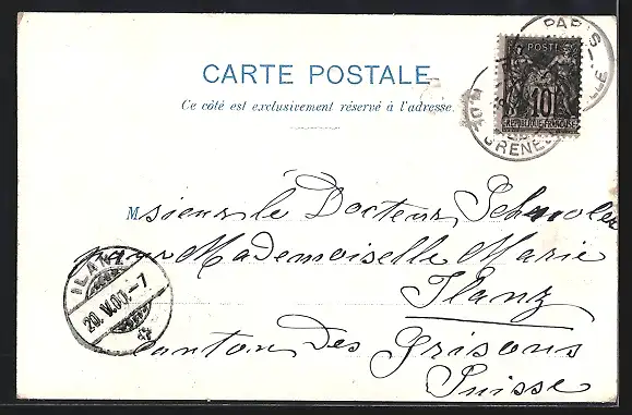 Personenbezogene Daten auf der Rückseite der Karte wurden durch blauen Textmarker unkenntlich gemacht. Die blauen Stellen sind auf die Vorderseite durchgeweicht und wirken sich negativ auf das Postkartenfoto aus