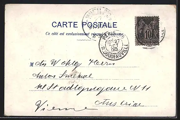 Personenbezogene Daten auf der Rückseite der Karte wurden durch blauen Textmarker unkenntlich gemacht. Die blauen Stellen sind auf die Vorderseite durchgeweicht und wirken sich negativ auf das Postkartenfoto aus