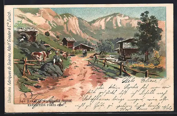 Lithographie Paris, Exposition universelle de 1900, Les Etables au Village Suisse