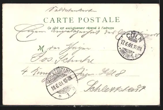 Personenbezogene Daten auf der Rückseite der Karte wurden durch blauen Textmarker unkenntlich gemacht. Die blauen Stellen sind auf die Vorderseite durchgeweicht und wirken sich negativ auf das Postkartenfoto aus