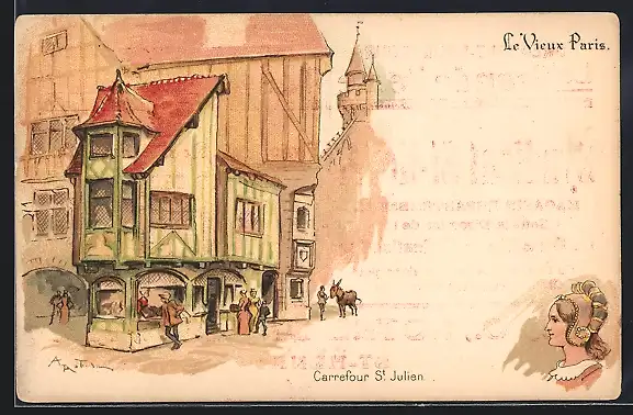 Lithographie Paris, Le Vieux Paris, Carrefour St. Julien, Femme