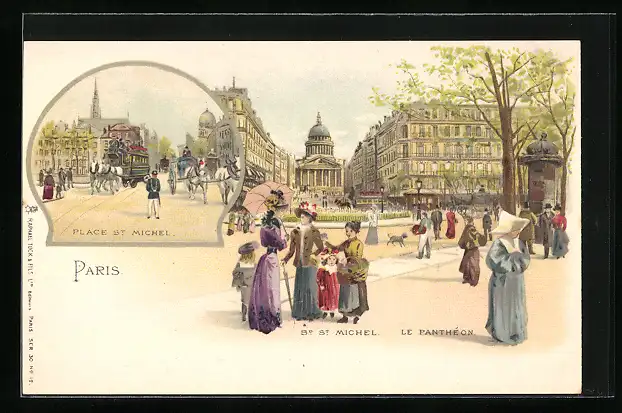 Lithographie Paris, Place St. Michel, Le Pantheon