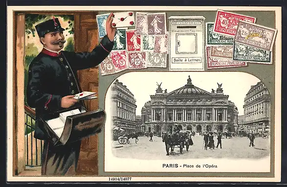 Lithographie Paris, Place de l`Opéra, Briefträger mit Umschlag