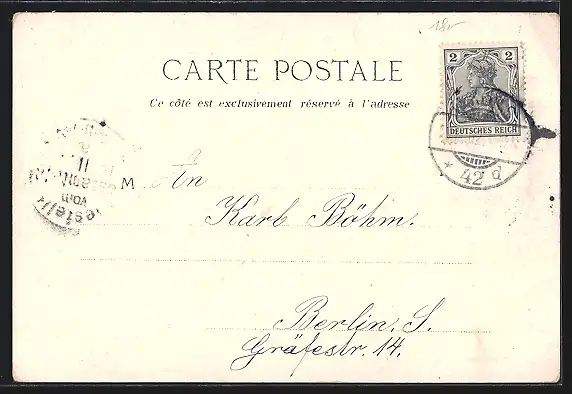 Personenbezogene Daten auf der Rückseite der Karte wurden durch blauen Textmarker unkenntlich gemacht. Die blauen Stellen sind auf die Vorderseite durchgeweicht und wirken sich negativ auf das Postkartenfoto aus