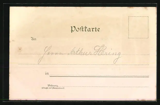 Personenbezogene Daten auf der Rückseite der Karte wurden durch blauen Textmarker unkenntlich gemacht. Die blauen Stellen sind auf die Vorderseite durchgeweicht und wirken sich negativ auf das Postkartenfoto aus