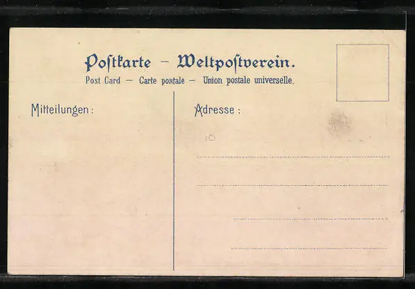 Personenbezogene Daten auf der Rückseite der Karte wurden durch blauen Textmarker unkenntlich gemacht. Die blauen Stellen sind auf die Vorderseite durchgeweicht und wirken sich negativ auf das Postkartenfoto aus