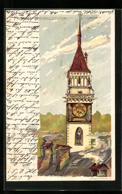 Personenbezogene Daten auf der Rückseite der Karte wurden durch blauen Textmarker unkenntlich gemacht. Die blauen Stellen sind auf die Vorderseite durchgeweicht und wirken sich negativ auf das Postkartenfoto aus