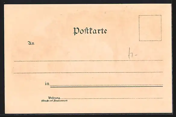 Personenbezogene Daten auf der Rückseite der Karte wurden durch blauen Textmarker unkenntlich gemacht. Die blauen Stellen sind auf die Vorderseite durchgeweicht und wirken sich negativ auf das Postkartenfoto aus