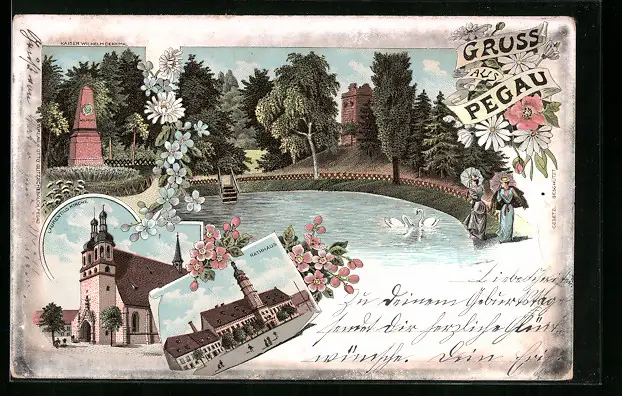 Lithographie Pegau, Rathaus und Laurentius Kirche