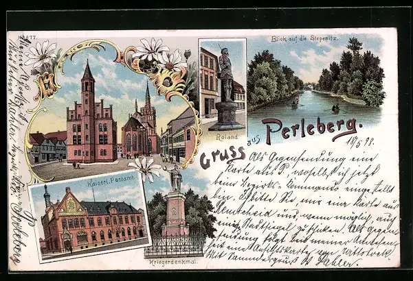 Lithographie Perleberg, Kriegerdenkmal, Roland, Postamt