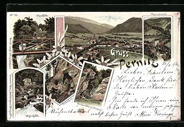 Lithographie Pernitz, Karnerwirth, Myrafälle, Steinwandklamm