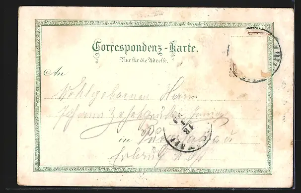 Personenbezogene Daten auf der Rückseite der Karte wurden durch blauen Textmarker unkenntlich gemacht. Die blauen Stellen sind auf die Vorderseite durchgeweicht und wirken sich negativ auf das Postkartenfoto aus