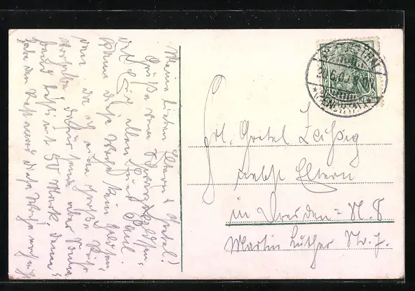 Personenbezogene Daten auf der Rückseite der Karte wurden durch blauen Textmarker unkenntlich gemacht. Die blauen Stellen sind auf die Vorderseite durchgeweicht und wirken sich negativ auf das Postkartenfoto aus