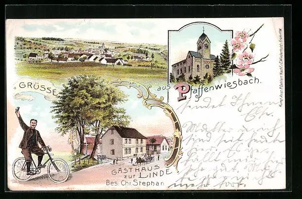 Lithographie Pfaffenwiesbach, Totalansicht mit Gasthaus zur Linde